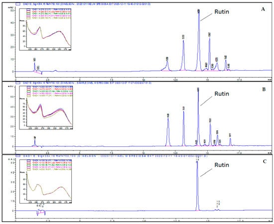 HPLC chromatogram of: (A) CPEE extract, (B) CPFD extract, and (C) the rutin standard at 14.2 min.
