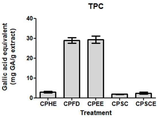 Total phenolic content of CPEs. The data are presented as the mean ± SEM of five independent experiments (n = 5).
