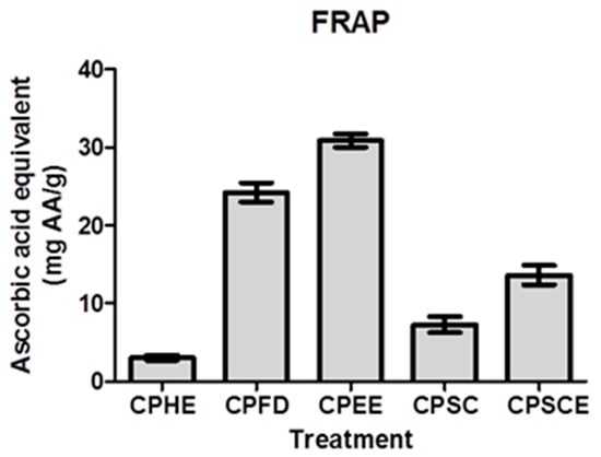 Ferric-reduced antioxidative power (FRAP) activity of CPEs. The data are presented as the mean ± SEM of five independent experiments (n = 5).