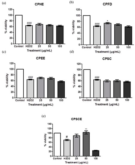 The viability of Hs27 fibroblast cells post-treated with (a) CPHE, (b) CPFD, (c) CPEE, (d) CPSC and (e) CPSCE after being exposed to H2O2. The data are presented as means ± SEM (n = 6). The significant difference between the groups was calculated using one-way ANOVA with Tukey´s post-hoc test. * represents p < 0.05, and ** represents p < 0.01 compared to H2O2; # represents p < 0.05, and ### represents p < 0.001 compared to the control.