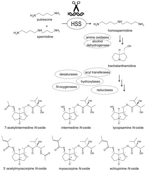 PAs are specific plant secondary metabolites that are constitutively produced by plants as part of their natural chemical defense against herbivores [16,17]. They occur scattered in about 3% of all plants world-wide and frequently in species relevant for human and animal consumption [18,19,20]. Thirteen distantly related angiosperm plant families have been reported to contain PA-producing species with the main occurrences in the Boraginaceae, Asteraceae, Apocynaceae, Convolvulaceae, Orchidaceae, and Fabaceae [21,22]. Over 660 PAs have been identified in about 6000 plant species and about half of them are deemed toxic [23]. Structurally, PAs contain either a saturated or a 1,2-unsaturated necine base moiety that is esterified with one or more necic acids. PAs with the unsaturated necine base are regarded as potentially toxic exerting hepatotoxic, pneumotoxic, hemolytic, antimitotic, teratogenic, mutagenic, and carcinogenic effects for, both, humans and livestock [14,16,24]. A deeper understanding of PA biosynthesis should allow the development of strategies of metabolic engineering for the manipulation of the PA biosynthetic pathway in order to remove these toxic metabolites and to allow the use of the other beneficial natural products in these medicinal plants. According to our present knowledge, the first step in PA biosynthesis is catalyzed by homospermidine synthase (HSS) [25,26]. HSS has evolved several times independently in several PA-producing lineages by the duplication of the gene encoding deoxyhypusine synthase (DHS) [27,28,29], an enzyme of primary metabolism that is involved in the posttranslational activation of the eukaryotic translation initiation factor 5A [30]. HSS catalyzes the transfer of the aminobutyl group from spermidine to putrescine resulting in the PA-specific precursor homospermidine (Figure 1) [25,31]. Unlike its substrates, namely putrescine and spermidine, homospermidine is regarded as a rare polyamine that is a characteristic intermediate in PA-producing plants, as it is exclusively incorporated into the necine base backbone [32]. HSS has been shown to be expressed in diverse specialized cells and tissues in various plant lineages [33,34,35]. In comfrey, HSS has been localized in the cells of the root endodermis and in specific cells of young leaves subtending a developing inflorescence [36,37]. The identification and characterization of further enzymes involved in PA biosynthesis and strategies for their manipulation by the most recent genome-editing techniques might pave the way for the development of a new generation of medicinal plants with a reduced level or even the absence of toxic PAs to provide raw materials for safer phytopharmaceuticals.