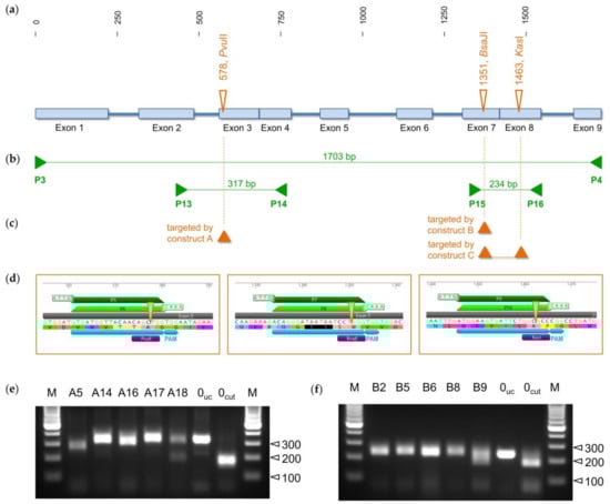 CRISPR/Cas9 approach for the manipulation of the hss gene. (a) Genomic structure of the hss gene with restriction sites at exons 3, 7, and 8 that were targeted by sgRNAs with specific protospacer motives. (b) Primer positions for the amplification of the complete and partial gene sections. (c) Gene regions targeted by the CRISPR/Cas9 constructs A, B, and C. (d) Protospacer sequences used in this study targeting exon 3, exon 7, and exon 8. The predicted sites of the Cas9-mediated double-strand breaks within the recognition sites of the endonucleases are indicated by arrow heads. Primers used for the sgRNA cassette are given in Table A1. PAM, protospacer adjacent motif. (e,f) Restriction analyses of genomic fragments amplified with primer pairs P13/P14 including exon 3 and P15/P16 covering exon 7 and 8 after incubation with PvuII (e) and BsaJI (f). Resulting fragments were separated on a 3% agarose gel by using the GeneRuler 100 bp DNA ladder.