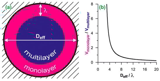(a) The scheme of the division of cylindrical adsorption space into the monolayer and the multilayer. Deff is the effective diameter and λ is the monolayer thickness; (b) the ratio of monolayer and multilayer volumes plotted as the function of the effective diameter. The diameters are reduced by the monolayer thickness.