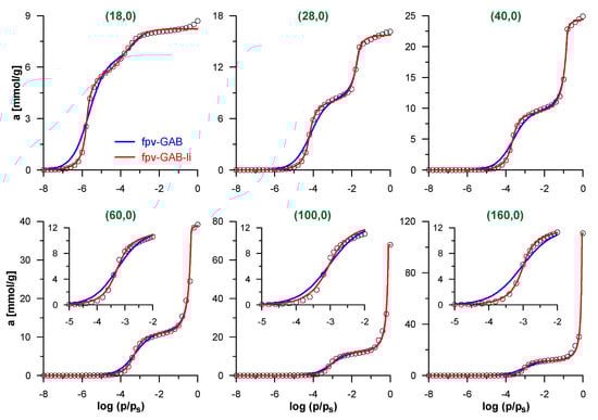 The verification of our model against the simulated isotherms justifies its application to analyze the experimental data. Figure 4 shows the results of the fitting of the experimental N2 adsorption isotherms for the selected studied systems. The results for the remaining systems and all fitting parameters are given in Supplementary Materials (Figures S2 and S3, Tables S3 and S4). As in all cases, the optimized value of A in fpv-GAB-li model is practically equal to 0; this approach simplifies to the basic fpv-GAB one (the values of the other best-fit parameters in both models become the same). As a consequence, only one theoretical curve is shown in each figure. We suggest that the apparent lack of the influence of lateral interaction on the adjustment of the experimental isotherms is a consequence of the heterogeneity of the pore walls in the real samples. If the energetic heterogeneity of the solid–fluid potential is large, the adsorption process begins on the sites of the highest energy, regardless the (weak) lateral fluid–fluid interactions. As the gas pressure increases, less adsorbing sites begin to be filled. The adsorbed amount increases progressively and the sharp step corresponding to the monolayer completion is not observed. Such behavior was observed for many the real adsorbents—see for example [32,44,45]. Nevertheless, the quality of the fits for the isotherms studied here is quite good, as indicated by the high DC values collected in Tables S3 and S4 in Supplementary Materials. The theoretical model reflects well the shape of the isotherms. The only exception is the medium-pressure range of the isotherms of the MCM-41-12 to MCM-41-18 materials. Here, the theoretical model does not precisely reproduce the experimental points at the beginning of the multilayer formation pressure range.