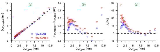 (a) Effective pore diameters Deff,model calculated using Equation (2) and fpv-GAB (blue circles) or fpv-GAB-li (red triangles) fits of simulated isotherms of N2 adsorption in CNTs. The diameters are plotted as the function of the geometrical diameter of CNTs (Deff,geo). The dashed line represents Deff,model = Deff,geo; (b,c) the absolute (b) and relative (c) differences between Deff,model and Deff,geo. The horizontal dashed lines correspond to Deff,model = Deff,geo.