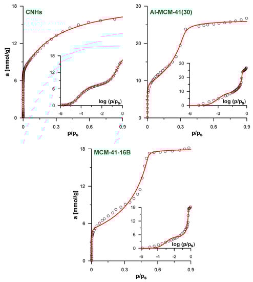 Nine experimental isotherms of N2 adsorption in cylindrical pores, measured at N2 boiling point, have been taken from the literature. They report the N2 adsorption inside carbon nanohorns (CNHs) [50] and in two series of MCM-41 materials [51,52]. Despite the fact that two parts, i.e., the conical and cylindrical ones, can be divided in the structure of CNHs [53], the internal pores of these materials are often modeled as tubular, i.e., CNHs are approximated by CNTs [54]. The presence of the conical part can be neglected because its volume is negligible. Previously, it was shown by us, via simulation, that there are no significant differences in the shapes of the low-temperature N2 isotherms inside infinite CNH and CNT of the same diameter, when the length of CNH is close to that observed for the real CNHs [55]. The MCM-41 type materials have cylindrical geometry of pores and a monomodal distribution of the pore diameters confirmed by XRD, TEM, and adsorption measurements [14,56]. The first series of the analyzed MCM-41 consists of three aluminosilicates samples modified with Al [51]. They were denoted according to the Si/Al molar ratios of the gels used for their preparation (60, 30, and 15) as Al-MCM-41(60), Al-MCM-41(30) and Al-MCM-41(15), respectively, although the final Si/Al ratios in the obtained samples are equal to 36.8, 19.9 and 12.2, respectively [51]. The second series consists of five pure-silica MCM-41 materials prepared using alkyltrimethylammonium halides with different length of alkyl group (C12, C16 and C18) [52]. The samples prepared using a surfactant containing hexadecyl group (C16) as a template were synthesized by three different methods [52]. Therefore, the samples in the second series have been denoted as MCM-41-12, MCM-41-16A, MCM-41-16B, MCM-41-16C and MCM-41-18. In all the experimental isotherms we have neglected the experimental points for the relative pressure above 0.9. The significant increase of the adsorption amount observed in this range results mainly from the adsorption in macropores and on the external surfaces of the real samples, not analyzed here.