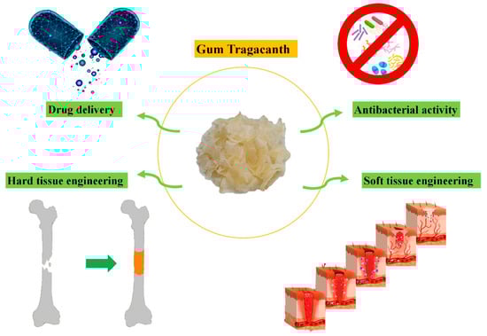 Gums are known to be pathological products generated after plant injuries or due to unfavorable conditions (e.g., drought) through the breakdown of cell walls (extracellular formation; gummosis). Polysaccharide gums are ones of the most abundant raw materials in nature. Besides being renewable sources, they are easily accessible, relatively affordable, non-toxic, and environmentally friendly, causing their worldwide usage from the food industry to health care systems. Among different well-characterized gums, gum tragacanth (GT) is recognized as a versatile material in biomedicine. Generally, GT, also known as Katira, is sourced from Central Asia and Eastern countries, and Iran is the largest producer and exporter of this natural gum [1,2].