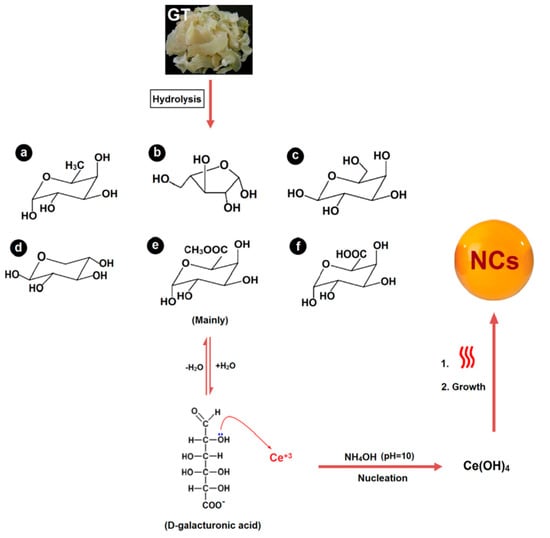 Schematic representation showing the usability of GT in the green synthesis of nanoceria particles (NCs): (a) α-L-fucose, (b) L-arabinose, (c) β-D-galactose, (d) β-D-xylose, (e) α-D-Galacturonic acid methyl ester, and (f) α-D-galacturonic. Reproduced from ref [54], Copyright 2014, Elsevier.