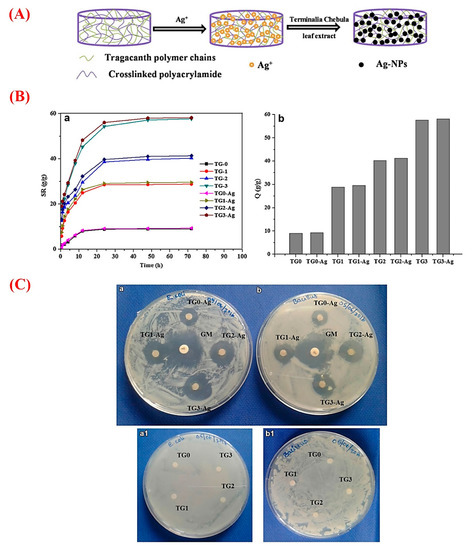 (A) Schematic representation of the formation of silver nanoparticles (Ag-NPs) in gum tragacanth (TG) hydrogel networks. (B) Graphs a and b exhibiting swelling and equilibrium swelling ratio Q (g/g) of the TG hydrogels (TG0, TG1, TG2, and TG3) and their Ag-NPs embedded counterparts (TG0-Ag, TG1-Ag, TG2-Ag, and TG3-Ag), respectively. (C) The results of the antibacterial activity of the Ag-NPs containing TG0, TG1 TG2, and TG3 hydrogels and the pristine TG hydrogels on (a/a1) E. coli, and (b/b1) B. subtilis [Gentamicin (GM) antibiotic is as the positive control]. Note: TG0, TG1, TG2, and TG3 contain 0, 100, 200, and 400 mg of GT. Reproduced with permission from [75], Copyright 2017, Springer Nature.