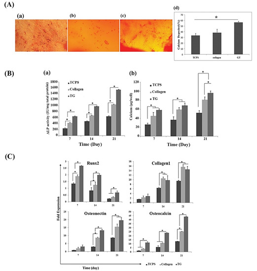 (A) Microscopic photographs of differentiated human adipose-derived mesenchymal stem cells cultured on tissue culture polystyrene (TCPS) (a), collagen (b), and gum tragacanth (GT) (c) stained with Alizarin Red S after 21 days of culturing in the osteogenic induction medium (Magnification × 40), as well as the graph (d) showing the quantified values for calcium deposition of different groups. (B) Alkaline phosphatase (ALP) activity of (a) and calcium content (b) of the stem cells cultured on TCPS, collagen, and GT after 7, 14, and 21 days of culturing in the osteogenic differentiation medium (asterisks significant difference between the groups at p < 0.05). (C) Real-time PCR data exhibiting relative expression of osteogenic-related genes including Runx2, collagen type 1, osteonectin, and osteocalcin in the stem cells cultured on TCPS, collagen, and GT at day 7, 14, and 21 (* refers to the significant difference between the groups at p < 0.05). Reproduced with permission from [16], Copyright 2016, Elsevier.