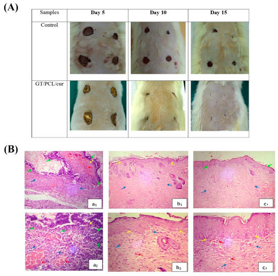 (A) Macroscopic observation of the wound closure in un-treated diabetic rats and the animals treated with gum tragacanth (GT)/poly vinyl alcohol (PVA) electrospun nanofibers containing 3% curcumin (Cur) at 5, 10, 15 days post-surgery. (B) Microscopic observations of H&E stained slides of the untreated skin wounds (a1,a2) and those treated with the PCL/GT/Cur nanofibers (b1,b2) and the PCL/GT/Cur loaded with umbilical cord Wharton jelly-derived mesenchymal stem cells (c1,c2) after 15 days of surgery. Note that granulation tissue, epithelial regeneration, angiogenesis, and collagen fibers were indicated by blue, yellow, red, and green arrows, respectively. Magnification of a1, b1, c1 is 100×, and a2, b2, c2 is 400×. Reproduced with permission from [108], Copyright 2016, Elsevier.