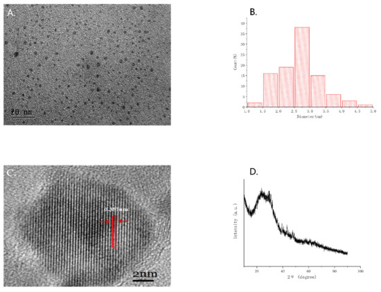 (A) Transmission electron microscopy (TEM) images of GRR-CDs displaying ultra-small particles. (B) Histogram depicting particle size distribution. (C) High-resolution TEM (HRTEM) image of GRR-CDs. (D) XRD pattern.