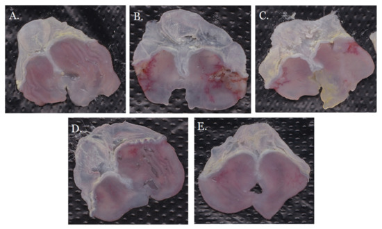 Gastric mucosal injury of mouse in (A) control group, (B) model group, (C) GRR-CDs high-dose group, (D) GRR-CDs medium-dose group and (E) GRR-CDs low-dose group.