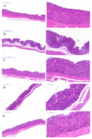 Morphological section of mouse gastric tissue of (A) control group, (B) model group, (C) GRR-CDs high-dose group, (D) GRR-CDs medium-dose group and (E) GRR-CDs low-dose group.