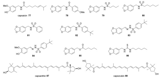 Capsaicinoids are the most studied compounds related to red peppers of the Capsicum genus. Jalapeño pepper (C. annuum), habanero (C. chinense), and tabasco (C. frutescens) have a high capsaicinoid concentration, ranging from 0.2% to 4.2% [193,194,195,196], depending on environmental conditions and quantification methods [47]. Capsaicin 77 (Figure 2), is the main capsaicinoid metabolite found in red peppers and can be isolated mainly from fruits of the Capsicum species [197]. The analgesic, pungent, and pro-apoptotic effects of 77 are related to their interaction with Transient Receptor Potential Vanilloid (TRPV) receptors at the sensory neurons [198]. This family of transmembrane receptors (TRPV1 to TRPV6) is found in several tissues and mediates the influx of Ca2+ into the cytosol [199]. The TRPV receptors can be activated by many stimuli such as proton (H+), heat, and natural substances such as 28, 77, and resiferatoxin [200,201,202]. In sensory neuronal fibers, the activation of TRPV1 by 77 triggers a rapid increase in Ca2+ flux, causing neuronal depolarization and the characteristic burning sensation [203,204,205,206]. Compound 77 is also supposed to interact with other TRP receptors involved in cancer progression, such as TRPV6 [207] and TRPM8 [208]. Chow et al. (2007) [209] suggested that 77 induces apoptosis preferentially via TRPV6, with selectivity for tumor cells. Recently, however, the activity of 77 against TRPV6 was evaluated in a Ca2+ flux assay [134,210]. The authors observed that in this assay, the compound was not able to change the channel transport. Despite the mode of action of 77 still being inconclusive, further studies indicated that the modulation of TRP channels and enhancement on Ca2+ influx may trigger apoptosis by calpain activation and effector caspases as well [211]. This compound has been investigated against more than 40 types of tumors, attracting the attention of many researchers as a promising drug candidate for cancer treatment [128]. Upon treatment with 77, tumor cells undergo disruption of the mitochondrial membrane, increasing ROS generation and caspase-3 and -9 activity [212]. In vivo mice models revealed that administration of 77 significantly reduced tumor growth (>50%) in breast and leukemia cancers [76,213]. As the inherent pungency of 77 greatly limits its application in therapeutics, it has led several research groups to design analogues lacking pungency of 77 [129,131,132,133,210,214,215].