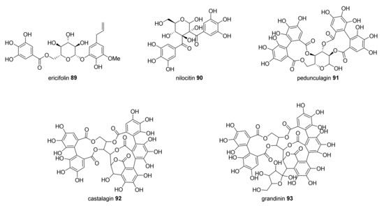 Amongst the other reviewed genus, Pimenta sp. is less explored and possesses fewer representatives (16 species). The cytotoxic compounds related to Pimenta sp. reported in the literature came from treatments with extracts of Pimenta dioica berries and leaves [19]. Curiously, breast cancer cells underwent autophagy, whereas prostate cancer cells underwent cycle arrest at the G1/S phase and also apoptosis. The proapoptotic activity of the extract was linked to the presence of glycopyranoside 89 (Figure 3), which induced apoptosis in LNCaP human prostate adenocarcinoma cells (IC50 < 5.0 µM) by reducing cyclin-D1, CDK4, and androgen receptor transcription [15,137]. However, the purified 89 has no activity against MCF-7 and MDA-MB-231 breast cancer cells [137]. Several cytotoxic polyphenols (90–93) isolated from P. dioica leaves were evaluated in further studies. These compounds were tested against MCF-7 breast, HepG2 liver, and HCT116 colon cancer cells (Table 1) [63]. Compound 91 was the most cytotoxic (IC50 = 18.4, 6.4, and 4.4 µM, respectively), presenting the most protective activity against ROS and nitric oxide (NO) release.