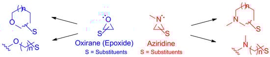 Oxirane (epoxide) yields cyclic and/or acyclic compounds with oxygen in blue, while aziridine and its transformations toward cyclic and/or acyclic nitrogen-containing molecules are shown in red.