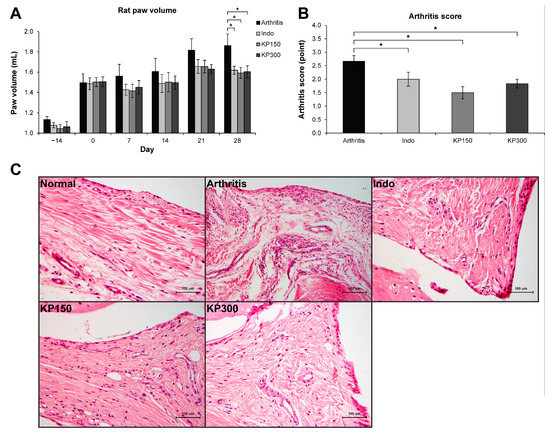 Figure 1. KP extract attenuates CFA-induced rat arthritis. (A) A graph shows an increase in the right paw volume of all groups on day 0, indicating the onset of an experimental RA induced by CFA injection. Then, the induced rats were fed with 3 mg/kg/day of indomethacin (Indo), 150 mg/kg/day of KP extract (KP150), or 300 mg/kg/day of KP extract (KP300) for another 28 days. The results show that Indo, KP150, and KP300 relatively decreased rat paw edema since day 7 and significantly on day 28, compared to the arthritis control group (Arthritis). (B) A significant reduction of arthritis severity scores, which were evaluated on day 28, was observed in the arthritis rats treated with Indo, KP150, and KP300, when compared with the arthritis control. (C) The H&E-Scheme 150. and KP300 groups. Results represent mean ± SEM of 3 rats (normal group) or 6 rats (treated groups). One-way ANOVA followed by the post hoc Fisher’s test was used to analyze the statistical difference (* p < 0.05).