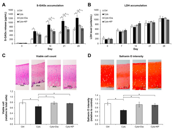 Figure 2. KP extract protects cartilage explant degradation. Porcine cartilage explant degradation was stimulated by a combination of 2 ng/mL of IL-1β and 4 ng/mL of IL-17A (Cyts) with or without KP extract (25 μg/mL) or 50 μM of diacerein (Dia) for 28 days. The control (Ctrl) explants were left untreated. A significant increase in accumulation of released S-GAGs induced by the combined cytokines was significantly decreased when co-treated with KP extract or diacerein (A). The non-significant differences in lactate dehydrogenase (LDH) accumulation in the culture media among all treatment groups and the control indicate the non-cytotoxic effects of the reagents and KP extract on the cartilage cells (B). Histopathological examination of cartilage disc (day 28) illustrates restoring of the viable cell numbers (C) and safranin O intensity (D) in co-treatment of the combined cytokines with KP extract or diacerein. Results represent mean ± SD of three independent experiments. One-way ANOVA followed by the post hoc Tukey multiple comparison test was used to analyze the statistical difference (* p < 0.05).