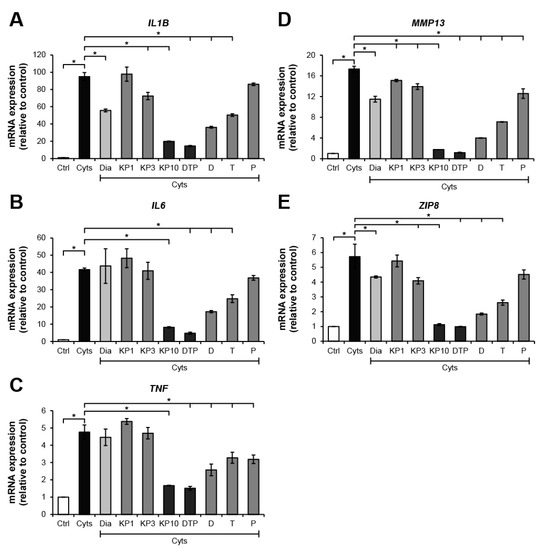 Figure 3. KP extract and its major components suppress arthritis-related gene expressions in SW1353 cells. SW1353 was activated by a combination of 2 ng/mL of IL-1β and 4 ng/mL of IL-17A (Cyts) for 24 h with or without diacerein (Dia; 50 μM), KP extract (1, 3, and 10 μg/mL), 5,7-dimethoxyflavone (D; 3.3 μg/mL), 5,7,4′-trimethoxyflavone (T; 2.6 μg/mL), 3,5,7,3′,4′-pentamethoxyflavone (P; 2.2 μg/mL) or a mixture of the three major compounds (DTP), which is equal to the estimated proportions in the KP extract at 10 μg/mL (D: T: P = 3.3: 2.6: 2.2 μg/mL). Ctrl is an untreated control. The dramatic increase in mRNA expressions of the arthropathy-associated inflammatory cytokines genes, IL1B (A), IL6 (B), and TNF (C), cartilage-degrading enzyme, MMP13 gene (D), and zinc transporter 8 (ZIP8) gene (E), was found when the cells were treated with the combined cytokines. These increased expressions were significantly suppressed by KP extract at a concentration of 10 μg/mL, which was similar to the effect of the mixture of the three major compounds that equal to their amounts in 10 μg/mL KP extract. Results represent mean ± SD of three independent experiments. One-way ANOVA followed by the post hoc Tukey multiple comparison test was used to analyze the statistical difference (* p < 0.05).