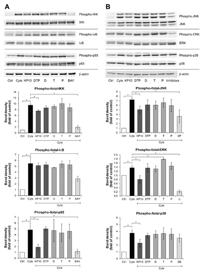 Figure 4. KP extract suppresses the NF-κB and MAPK pathways in SW1353 cells. SW1353 cells were pretreated for 2 h with KP extract (10 μg/mL), 5,7-dimethoxyflavone (D; 3.3 μg/mL), 5,7,4′-trimethoxyflavone (T; 2.6 μg/mL), 3,5,7,3′,4′-pentamethoxyflavone (P; 2.2 μg/mL) and a mixture of the three major compounds (DTP), which equal to the estimated proportions in the KP extract at 10 μg/mL (D: T: P = 3.3: 2.6: 2.2 μg/mL), and signaling inhibitors, including BAY11-7082 (BAY; 20 µM), SP600125 (SP; 10 µM), U0126 (U; 5 µM), and SB203580 (SB; 1 µM). The cells were then co-treated with IL-1β 2 ng/mL and IL-17A 4 ng/mL (Cyts) for 25–30 min. The untreated group was left as a control (Ctrl). The representative immunoblots against NF-κB and MAPK signaling molecules are shown in (A) and (B), respectively. Bar graphs are mean ± SD of two independent experiments in the ratios between the band intensities of phosphorylated form and total form of each condition. One-way ANOVA followed by the post hoc Fisher’s test was used to analyze the statistical difference (* p < 0.05). The band density for each sample was normalized to β-actin. The full-length blot images are provided in Supplementary Data (Figures S6 and S7).