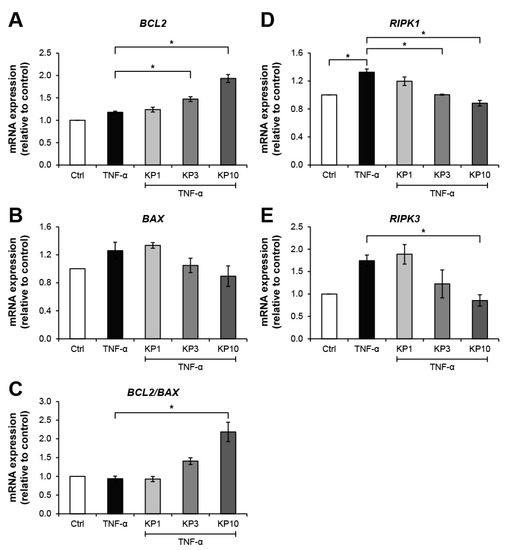 Figure 5. KP extract suppresses the expressions of necroptosis-related genes but promotes the anti-apoptosis gene. SW1353 cells were pretreated with TNF-α 10 ng/mL for 2 h to trigger cell death-associated gene expression, followed by a co-treatment with KP extract (1, 3, and 10 μg/mL) for 24 h. The untreated group was left as a control (Ctrl). In KP extract co-treated groups, an increasing trend of anti-apoptosis process was observed from the upregulation of BCL2 gene expression (A) and the suppression of BAX gene expression (B), which contributed to the increasing ratio of BCL2:BAX gene expressions (C). The upregulation of necroptosis-related gene expression, RIPK1 (D) and RIPK3 (E), induced by TNF-α was significantly suppressed by the KP extract at 10 μg/mL. Results represent mean ± SD of three independent experiments. One-way ANOVA followed by the post hoc Tukey multiple comparison test was used to analyze the statistical difference (* p < 0.05).