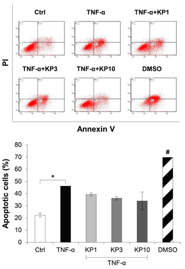 Figure 6. KP extract reduces the number of apoptotic cells. SW1353 cells were pretreated with TNF-α 50 ng/mL for 2 h and followed by co-treatment with the KP extract (1, 3, and 10 μg/mL) for another 48 h. DMSO (2.5%) was used as a positive control. The untreated group was left as a control (Ctrl). The number of apoptotic cells was counted by flow cytometry. The significant increase in apoptotic cells induced by TNF-α is counteracted by the KP extract, lead to a decreasing trend of the apoptotic cell number. Results represent mean ± SD of two independent experiments. One-way ANOVA followed by the post hoc Tukey multiple comparison test was used to analyze the statistical difference (* p < 0.05 and # p < 0.001 compared to the untreated control).