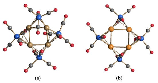 - Ciabatti, I.; Femoni, C.; Hayatifar, M.; Iapalucci, M.C.; Ienco, A.; Longoni, G.; Manca, G.; Zacchini, S. Octahedral Co-Carbide Carbonyl Clusters Decorated by [AuPPh3]+ Fragments: Synthesis, Structural Isomerism, and Aurophilic Interactions of Co6C(CO)12(AuPPh3)4. Inorg. Chem. 2014, 53, 9761–9770. [Google Scholar] [CrossRef]
