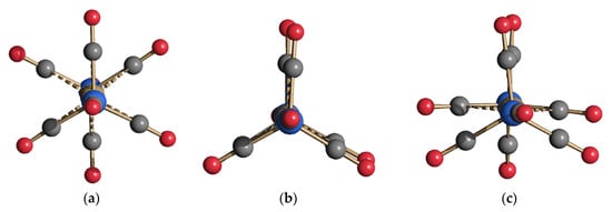 The three isomers of 2: (a) TBP-TBP staggered; (b) TBP-TBP eclipsed; (c) TBP-Td. Sub Van der Waals M···C(O) contacts are represented as fragmented lines (brown, Cu; blue, Co; red, O; grey, C) [39,40,41].