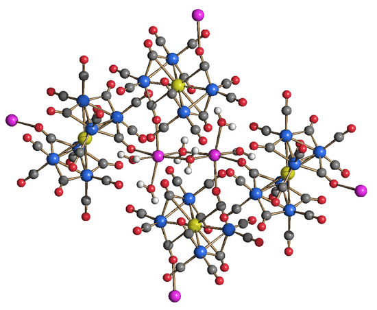 Polymerization isomerism may be described as two compounds having the same elemental composition but different molecular weights [32,33]. This is a very rare phenomenon, both in coordination chemistry and molecular cluster chemistry. Probably, this term was applied for the first time to a metal carbonyl cluster in the case of the triangle and square polymerization isomers [{MFe(CO)4}3]3− (M = Ag, Au) and [{MFe(CO)4}4]4−, which may be viewed as trimers and tetramers of [{MFe(CO)4}]− [34]. Further examples of polymerization isomerism may be found in the literature concerning metal carbonyls, even if they were referred to differently. For instance, the Ru tetracarbonyl may exist as a Ru3(CO)12 triangular isomer (trimer), or as a [Ru(CO)4]∞ polymer [35]. A similar phenomenon has been observed in the case of the 1:1 adduct between Cu+ and [Co(CO)4]− (1). Indeed, this may adopt the {CuCo(CO)4}4 square structure (tetramer) [36] or a {CuCo(CO)4}∞ polymeric structure (Figure 1 and Figure 2) [37]. In contrast, in the case of Ag, only the square tetramer {AgCo(CO)4}4 has been reported [38], whereas no Au related species has been described up to now. It must be remarked that {AgCo(CO)4}4 is perfectly planar, whereas {CuCo(CO)4}4 is not planar.
