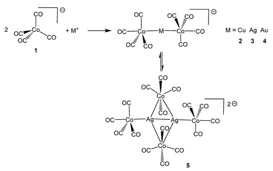 The M-Co(CO)4 (M = Cu, Ag, Au) system presents some further examples of structural isomerism in the case of the 1:2 adducts [M{Co(CO)4}2]− (M = Cu, 2; Ag, 3; Au, 4). In particular, three different isomers have been structurally characterized for 2 (see Results and Discussion) [39,40,41], whereas a single structure has been reported for 4 [42] and none for 3.