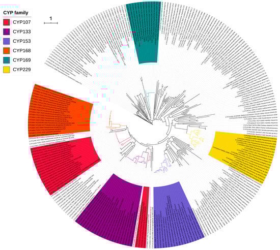 Phylogenetic analysis of P450s was carried out following the protocol previously described by our laboratory [54,55]. Briefly, the P450 protein sequences where aligned using the MAFFT v6.864 program [84], which is available at the Trex web server [85]. For tree inferring and optimization, the Trex web server [85] was used. Then, the server inferred the tree with different algorithms, including maximum likelihood, for the best phylogenetic tree in the least-squares sense. Finally, the best-inferred tree was visualized, colored and generated by the Interactive Tree of Life (iTOL) [86].