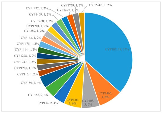 Based on the P450 nomenclature criteria [29,30], 277 P450s of Gammaproteobacterial species can be classified into 84 P450 families and 105 P450 subfamilies (Table 3). Annotation of P450s in this study was further verified by performing phylogenetic analysis (Figure 2). As shown in Figure 2, P450s belonging to the same family grouped together, indicating the correct annotation of P450s. Gammaproteobacterial species P450s identified in this study, along with their protein sequences and species, are presented in Supplementary Dataset 2. The number of P450 families in Gammaproteobacterial species is found to be highest compared to Firmicutes species, mycobacterial species and cyanobacterial species, indicating the highest diversity of P450s in Gammaproteobacterial species (Table 2). However, the number of P450 families in Gammaproteobacterial species was found to be lowest compared to Streptomyces species (Table 2). In order to understand the P450 diversity in Gammaproteobacterial species, the P450 diversity percentage was calculated by modifying the previously proposed formulae [54,57] to reflect the actual number of species with P450s. The new formula is presented below: