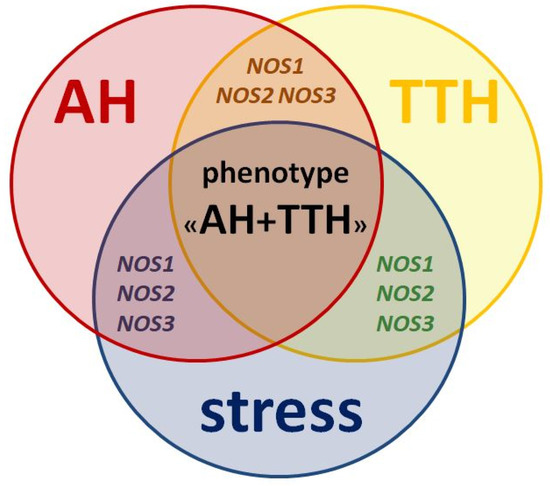 All three isoforms of the protein (nNOS, iNOS, eNOS) and its genes (NOS1, NOS2, NOS3) described above play key roles in the pathogenesis of both AH and TTH. They also negatively influence the leading environmental trigger of these nosologies: stress (Figure 2) and related neuropsychological disorders (anxiety and depression) [75].
