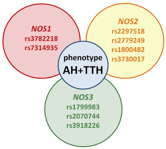 The NOS family proteins are encoded by the genes NOS1 (also known as: N-NOS, NC-NOS, nNOS, bNOS, IHPS1), NOS2 (also known as: I-NOS, NOS2A, iNOS, HEP-NOS), and NOS3 (also known as: eNOS, ECNOS) [18]. SNVs of genes encoding NOSs can affect their expression level and/or activity in organs and tissues. Experimental evidence suggests that nNOS (NOS1), iNOS (NOS2), and eNOS (NOS3) have important effects on cardiovascular function and pain, but their cumulative effect on the AH and TTH phenotype in humans is unknown. Therefore, the phenotype requires a better treatment. Association studies related to the role of SNVs of NOS1, NOS2, and NOS3 genes in the development of AH and TTH phenotype are of scientific and clinical interest.