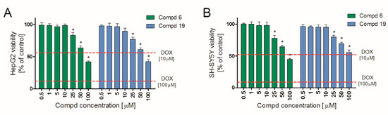 HepG2 (A) and SH-SY5Y (B) cell lines viability in the presence of 6 and 19. Cells were cultured with tested compounds for 24 h and then MTT assay was performed. Each bar represents viability expressed as mean % of control (non-treated cells) ± SEM. The dashed lines indicate the toxicity of the positive control (doxorubicin, DOX). * Statistical significance versus control (p < 0.05).
