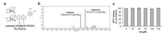 Identification of lutonarin (LN) in methanol extract of barley seedlings. (a) Chemical structure of LN; (b) Representative ultra-performance liquid chromatography and photodiode array (UPLC-PDA) chromatogram of barley sprout extract showing that saponarin and LN are the major constituents; (c) RAW 264.7 macrophages were pretreated with the indicated LN concentrations for 4 h, and then cultivated for 24 h with or without 1 µg/mL lipopolysaccharide (LPS). MTT assay of viable cell number after LN treatment. Values are presented as the mean ± SEM of three independent replicates. Lutonarin did not reduce viable cell number within the tested concentration range.