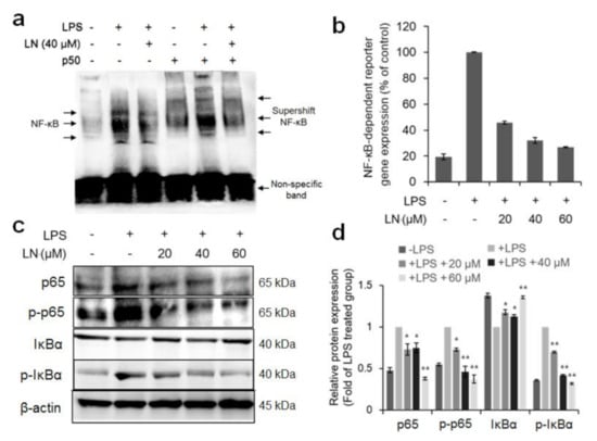 RAW 264.7 macrophage cells were transfected with a NF-κB luciferase promoter-reporter construct (pGL4.32 [luc2P/NF-kB-RE/Hygro]) in serum-free DMEM using FuGENE 6 (Promega, Madison, WI, USA) as a transfection reagent, according to the manufacturer’s instructions. Transfected cells were resuspended in DMEM containing 10% FBS and allowed to recover for 5 h. Then, the cells were switched to DMEM containing 1% penicillin-streptomycin for 24 h prior to experiments. Cells were pretreated with LN for 4 h, and then stimulated with 1 µg/mL LPS for 24 h. Total protein was isolated using passive lysis buffer (Promega, Madison, WI, USA) and luciferase activity determined by a microplate reader (Molecular Devices, San Jose, CA, USA). Relative luciferase activity was reported as fold changed as compared with untreated controls normalized for transfection efficiency.