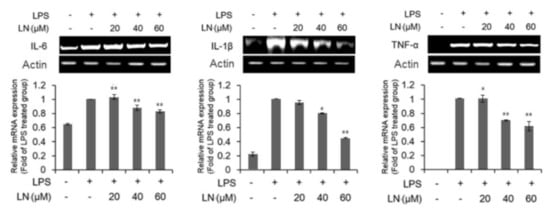 Lutonarin (LN) reversed LPS-induced elevations in proinflammatory cytokines. Macrophages were pretreated with the indicated LN concentration for 4 h, and then cultivated with 1 µg/mL LPS for 24 h. The mRNA levels were measured by reverse transcriptase polymerase chain reaction (RT-PCR). Actin was used as an internal control. Values are expressed as mean ± SEM of three independent replicates and compared to cells treated with LPS only. * p < 0.05 and ** p < 0.01 by ANOVA.