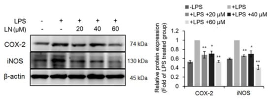Lutonarin reversed the LPS-induced upregulation of anti-inflammatory enzymes COX-2 and iNOS. RAW 264.7 cells were incubated with the indicated concentration of lutonarin (LN) for 4 h, and then treated with 1 µg/mL LPS for 24 h. Proteins were extracted, separated by SDS-PAGE, and quantified by Western blotting. Representative image of data is shown. A graph illustrates the density of the bands as compared with that of cells treated with LPS-only group. Data were from the three independent experiments and analyzed by ANOVA (* p < 0.05 and ** p < 0.01).