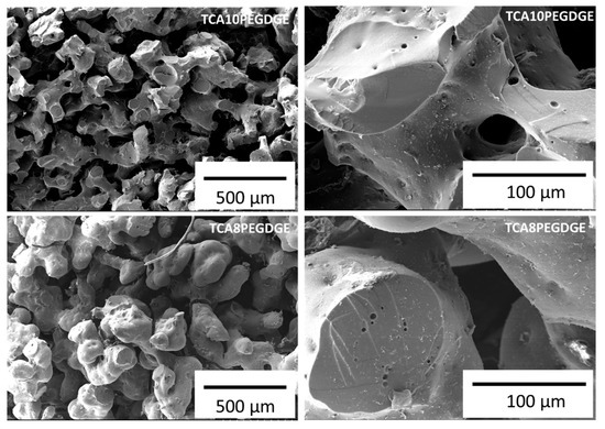 Figure 2 shows the morphology of the freeze-dried hydrogels with two different amounts of PEGDGE used in this study. Both type of hydrogels showed a macro porous structure with interconnected channels. This morphology is typically observed in porous carbon materials derived from lignin [33]. For the case of TCA10PEGDGE samples, the walls of the freeze-dried hydrogels showed a worm-like morphology with an average of particle size around 190 ± 20 µm. similar morphology was observed for case of the hydrogels based on the composition TCA8PEGDGE. However, these samples depicted a larger particle size around 300 ± 15 µm and the walls shower a more rounded morphology.