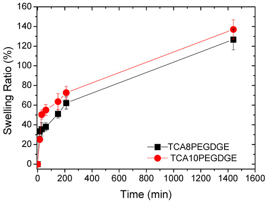 The swelling capacity was measured for the different lignin-based hydrogels in PBS. The results are shown in Figure 4. Both hydrogels showed similar swelling capacity indicating that the crosslinking destiny is similar in both hydrogels. Typically increasing crosslinking density reduces swelling capacity, which is related to formation of a network with a greater density and less porosity. This trend has been evidenced in numerous woks published until the date [35,36,37]. However, for this system the swelling mechanism is different since the responsible site for the water intake is the hydrophilic part coming from PEGDGE, due to the hydrophobic nature of lignin at neutral pH (PBS buffer). Therefore, the addition of more crosslinker to the lignin structure increases the number of hydrophilic sites in the reticulated polymer network and in consequence the swilling capacity. This fact can explain the slightly higher values obtained for the sample TCA10PEGDGE. The crosslinking mechanism given by nucleophilic reactions between hydroxyl groups in basic pH with epoxide rings (glycidyl ethers) produces ring-opening reaction generating secondary alcohols groups linked to a long ether chains which plays an important role for water absorption. This support the results obtained in the FTIR analysis that evidence of the presence of hydroxyl groups and the increasing number of ether linkages in the lignin based hydrogels.