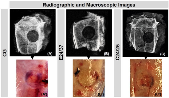 Evaluation of X-ray (A–C) and macroscopic features (A′–C′) of defects in the parietal bone rats. Groups: CG (A-A′); Hydrolyzed elastin matrix for 24 h at 37 °C—E24/37 (B-B′); Collagen matrix derived from hydrolyzed porcine intestinal serosa at 24 h at 25 °C—C24/25 (C-C′). All radiographic images show the central radiolucent cavity by removing the bone fragment in the control group (CG) and, in the groups treated with the matrices, the cavity corresponds to the low radiodensity of the biomaterials. Macroscopic images do not show any focus of infection or inflammatory process.