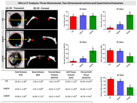 Three-dimensional and two-dimensional reconstructed micro-CT images of rat calvarial bone defects after 42 days, 3D—transaxial and 2D—coronal views of reconstructed images, (A,B, respectively). Defect without treatment (Control Group); defect filled with hydrolyzed elastin matrix for 24 h at 37 °C (E24/37 Group); defect filled with collagen matrix derived from hydrolyzed porcine intestinal serosa at 24 h at 25 °C (C24/25 Group). All groups showed a centripetal pattern of bone formation, evidenced by increased hyperdensity on the sides of the bone defect (red arrow—see dashed circle identifying the remaining bone), and thin bone plate under the dura mater in C24/25—scaffold (asterisk), remodeling areas (blue arrow) observed in margins of the remaining bone with less hyperdensity and central area of the hypodense defect. Graphs and table representing the quantitative results of the micro CT referring to Total Volume (TV, mm3), Bone Volume (BV, mm3), Percent Bone Volume (BV/TV, %), Soft tissue Volume (StV, mm3) and Percent Soft Tissue (StV/TV, %). In table and histogram, different lowercase letters indicate a significant difference between groups (a ≠ b ≠ c).