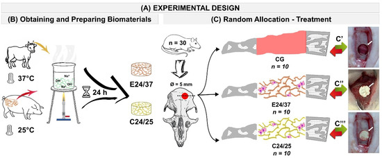 Schematic drawing of the experimental design (A). Preparation and application of biomaterials. Hydrolysis bovine auricular cartilage at 37 °C for 24 h and hydrolysis porcine intestinal serosa 24 h at 25 °C (B). Random Allocation—Treatment: Inclusion criteria: 30 male rats, Rattus norvegicus, Wistar, 112 days old and average weight of 360 g were randomly separated into three groups: Control Group (CG, n = 10), calvarial defects filled with blood clot (without scaffold); E24/37 (n = 10), bovine elastin matrix filled calvarial defects hydrolysed for 24 h at 37 °C and C24/25 (n = 10), porcine collagen matrix filled calvarial defects hydrolyzed for 24 h at 25 °C (C). Surgical procedure: C′—bone defect without scaffold; C″—bone defect filled E24/37 and C′′′—bone defect filled C24/25.