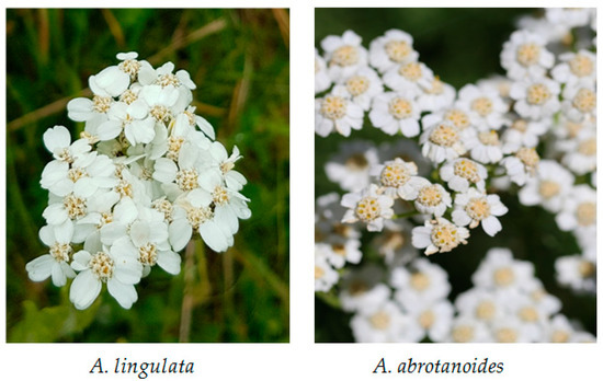 The present work is comprised of the identification and quantification of the compounds from the vegetative parts and inflorescences of Achillea lingulata Waldst. and A. abrotanoides Vis. (Figure 1). Achillea lingulata grows in the southeastern parts of Europe, with the main distribution in the Balkan Peninsula, Carpathians, and Belarus, while A. abrotanoides is endemic to the Balkan Peninsula. To isolate diverse compounds from these plants, four solvents with different polarities were used and all extracts were characterized by their phenolic composition and antioxidant and antimicrobial activities. To the best of our knowledge, there is little data about the phenolic composition and bioactive compounds in the roots [32] and aerial parts [33] of A. lingulata, and no data for A. abrotanoides.