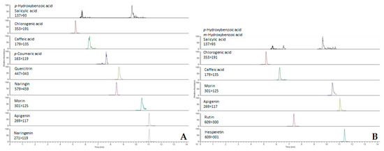 Chloroform as a solvent revealed the greatest diversity in phenolic profiles of both investigated plants. There were 7 phenolic acids and 9 flavonoids found in the vegetative part of A. abrotanoides, while 12 phenolic compounds in total were found in the extracts of A. lingulata. The highest concentration of phenolic compounds was detected in the chloroform extract of the inflorescence of A. abrotanoides (915.3 µmol/g), for which the MRM chromatograms are presented in Figure 3. As expected, the lowest content of phenolics was found in petrol ether extract of the vegetative part of A. lingulata (total concentration 2.1 µmol/g).