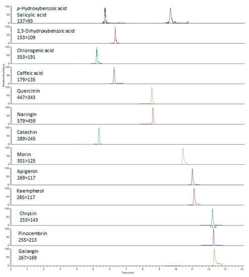 Standards of phenolic acids and flavonoids (apigenin, 2,3-dihydroxybenzoic acid, caffeic acid, catechin, chlorogenic acid, chrysin, ferulic acid, galangin, gallic acid, hesperidin, m-hydroxybenzoic acid, p-hydroxybenzoic acid, 5-hydroxyferulic acid, kaempferol, methyl p-coumarate, morin, myricetin, naringenin, naringin, p-coumaric acid, pinocembrin, quercetin, quercitrin, rosmarinic acid, rutin, salicylic acid, salicylic acid glucoside, sinapic acid, syringic acid, trans-cinnamic acid, vanillic acid, p-coumaric acid-d6, and salicylic acid-d4) were purchased from Sigma-Aldrich (Steinheim, Germany).