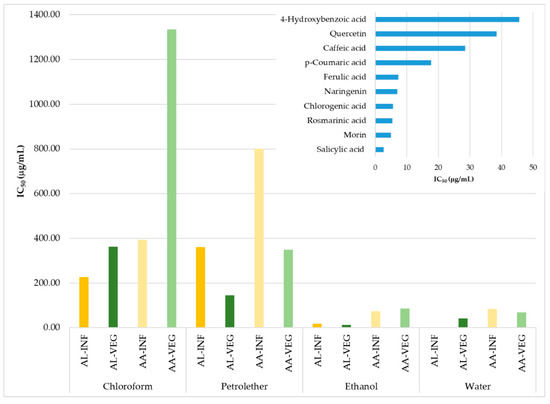 The polar aqueous and ethanolic extracts of both investigated species had the lowest IC50 values. The most potent extract was the water inflorescence extract of Achillea lingulata, with an IC50 value of 1.52 µg/mL. This extract contained significant levels of rosmarinic acid, which also possesses strong antioxidant activity against stable DPPH radicals (IC50 5.47 µg/mL). Moreover, the activity of this extract could be attributed to other phenolic compounds that are not quantified due to the lack of standards. Ethanol extracts of the inflorescence, as well as the vegetative part of Achillea lingulata, also showed a high antioxidant capacity, with IC50 values of 18.14 and 12.73 µg/mL, respectively. These extracts were rich in p-hydroxybenzoic acid, but also the flavonoid apigenin. The antioxidant potential is decreased via a decrease in the polarity solvent used [60,61], and the chloroform extracts of A. abrotanoides had the lowest antioxidant potential and the highest IC50 values (Figure 4). On the contrary, chloroform extracts of the vegetative parts and the inflorescence were rich in the phenolic compounds detected. Therefore, its low ability to scavenge stable radicals could be explained by the fact that chloroform isolates a high amount of chlorophylls and other pigments from leaves. These compounds do not possess significant antiradical activities [62].