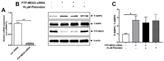 To identify the antidiabetic target of phloridzin, we performed PTP-MEG2 knockdown in 3T3-L1 preadipocytes using PTP-MEG2 siRNA for 72 h. Scrambled siRNA was used as a negative control. At the same time, we also incubated cells with 10 μM phloridzin for 72 h. Efficient suppression of PTP-MEG2 was confirmed by quantitative RT-PCR or Western blotting (Figure 2A,B). Consistent with our previous findings [9], we found that PTP-MEG2 knockdown significantly increased AMPK phosphorylation, suggesting that PTP-MEG2 can be a potential antidiabetic drug target (Figure 2B,C). In addition, AMPK phosphorylation was also enhanced in 10 μM phloridzin-treated cells, as compared to the control (Figure 2B,C). Furthermore, concurrent treatment with PTP-MEG2 siRNA and 10 μM phloridzin increased AMPK phosphorylation less than that of PTP-MEG2 siRNA knockdown alone, indicating that phloridzin targets PTP-MEG2 (Figure 2B,C).